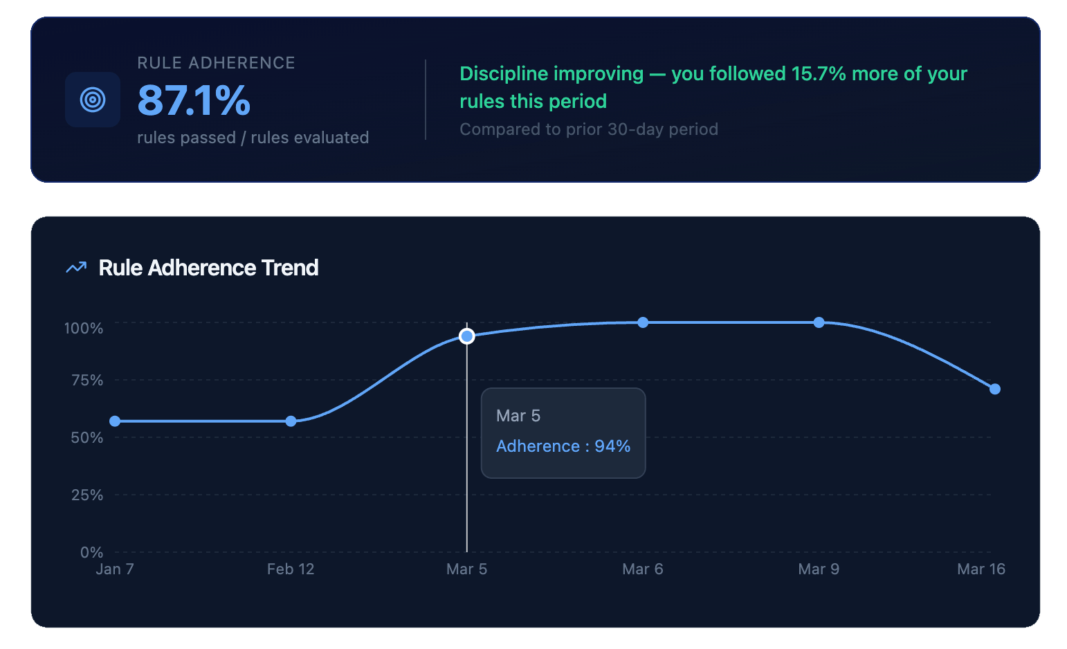 See your discipline score, rule violations, and performance in one clear view so you know if you’re actually following your system.